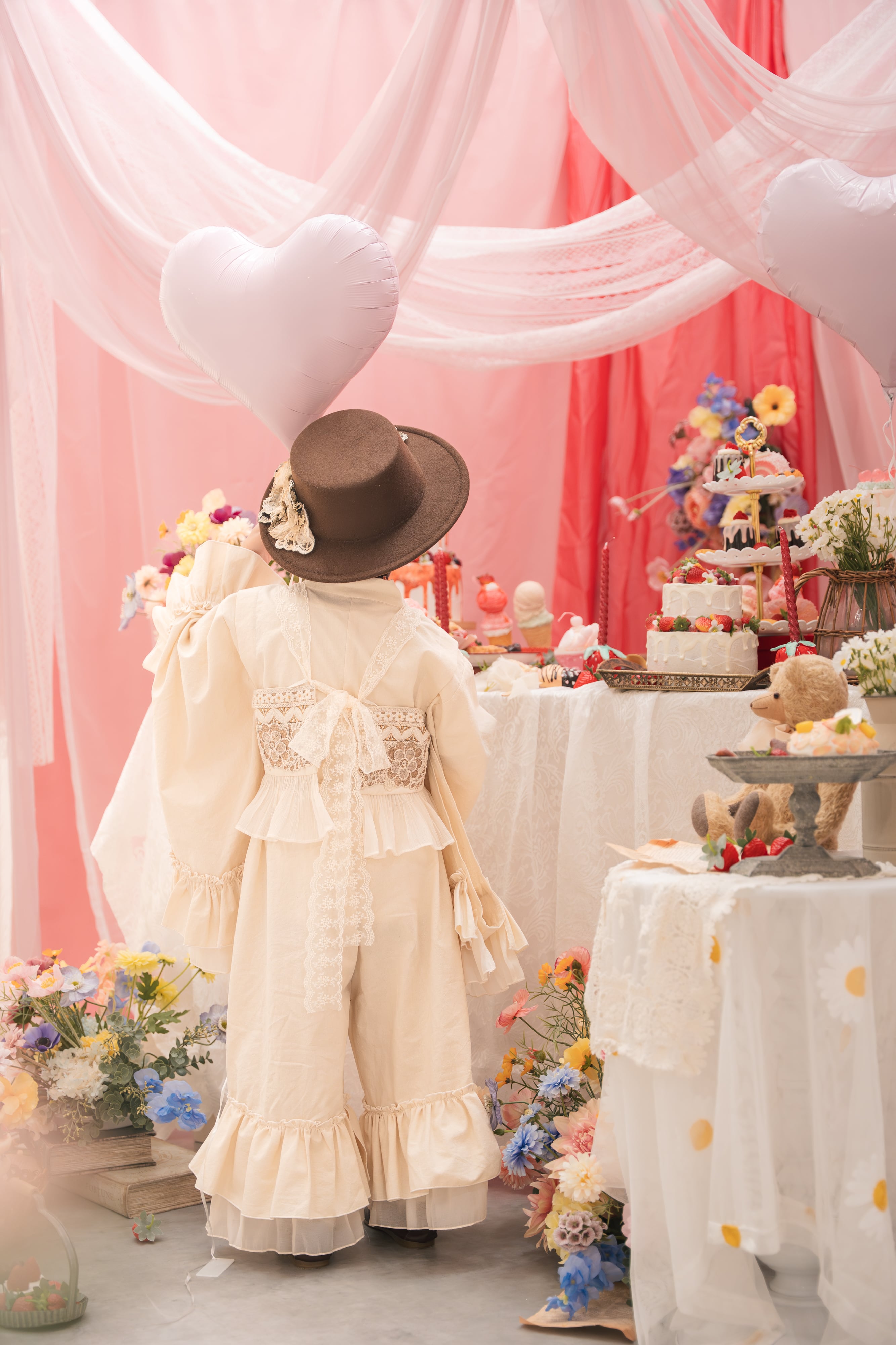 やわらかな生成りにレースとフリルを重ね、
