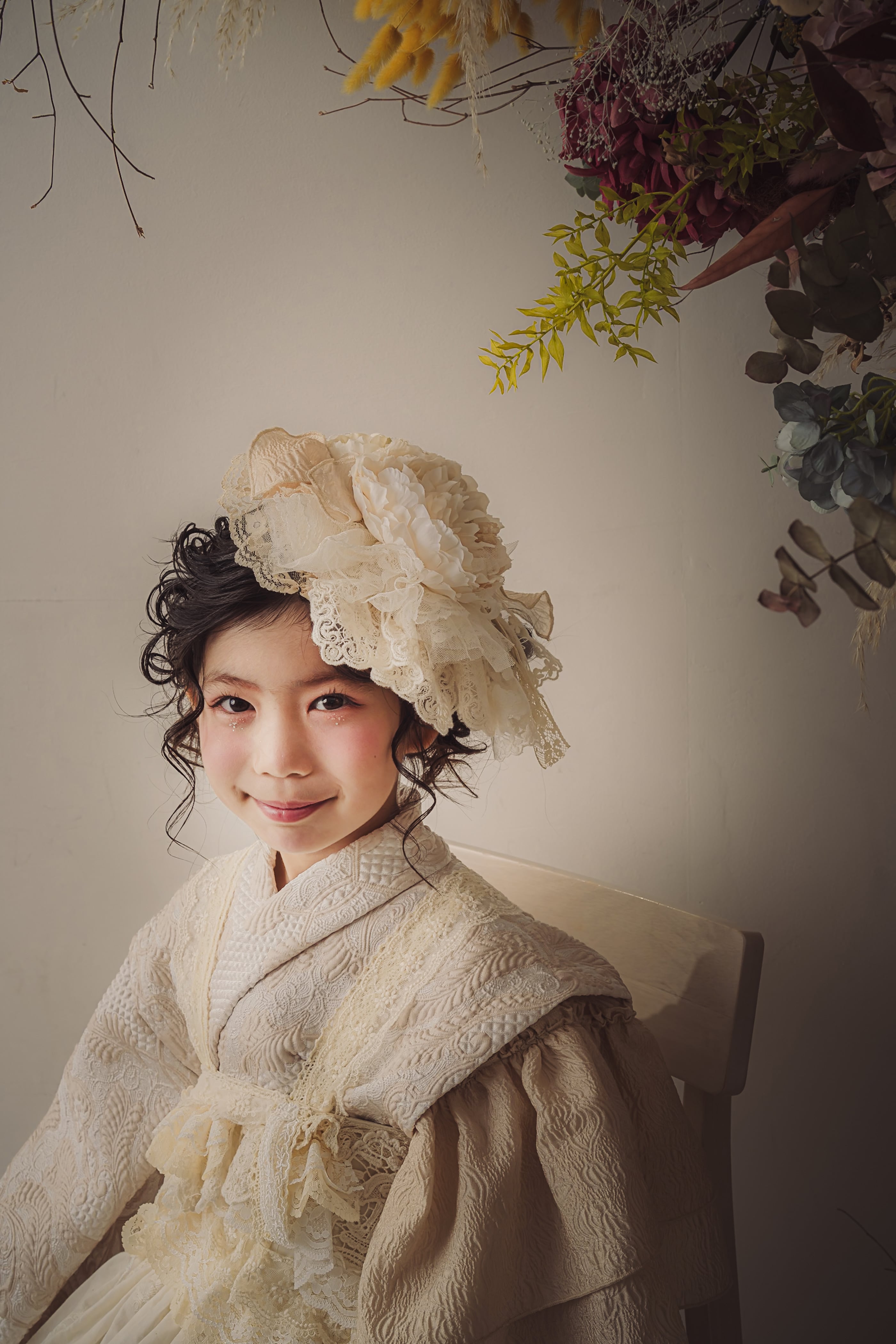 ヘッドドレスは、レースやお花を贅沢にあしらった華やかなトーク帽。