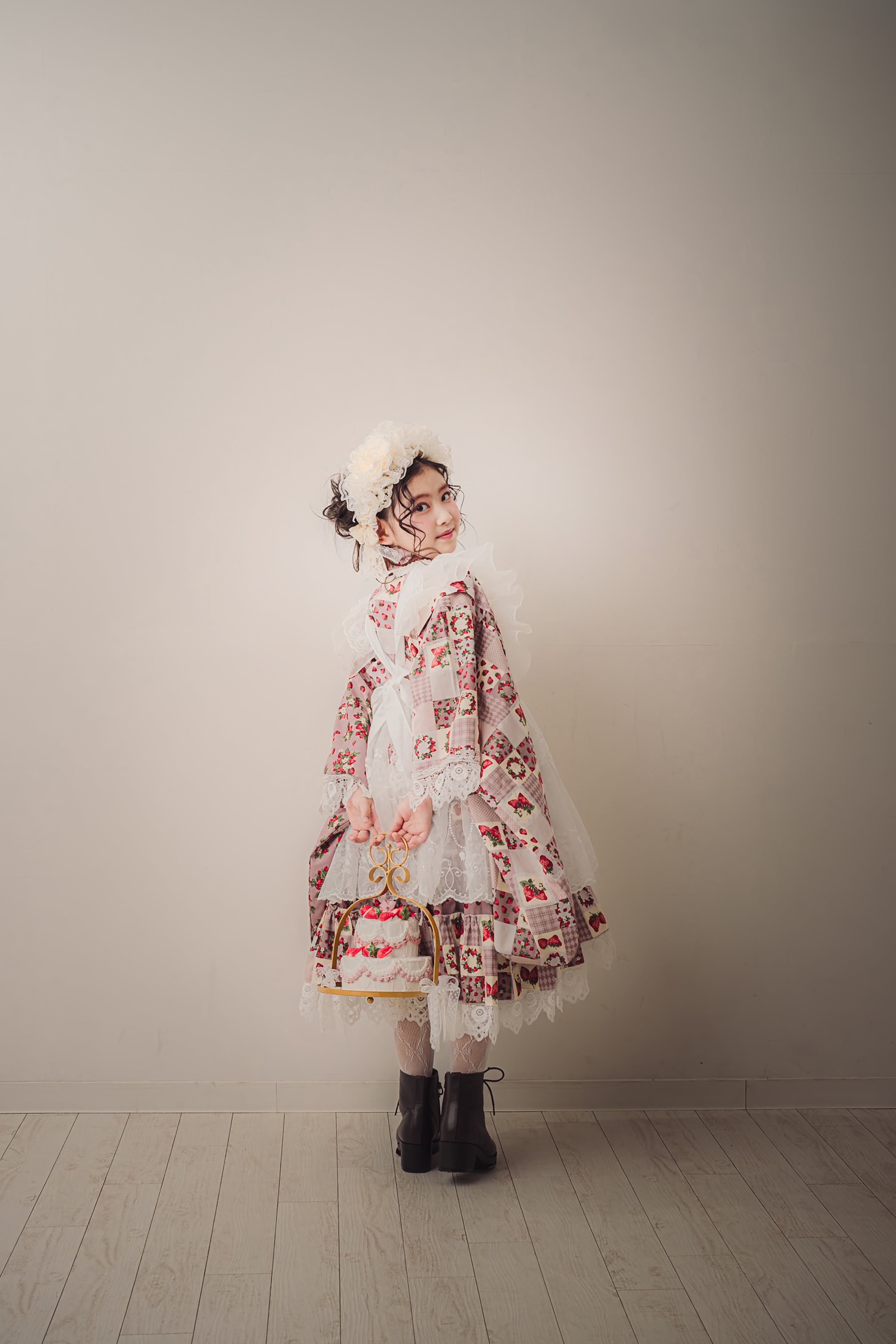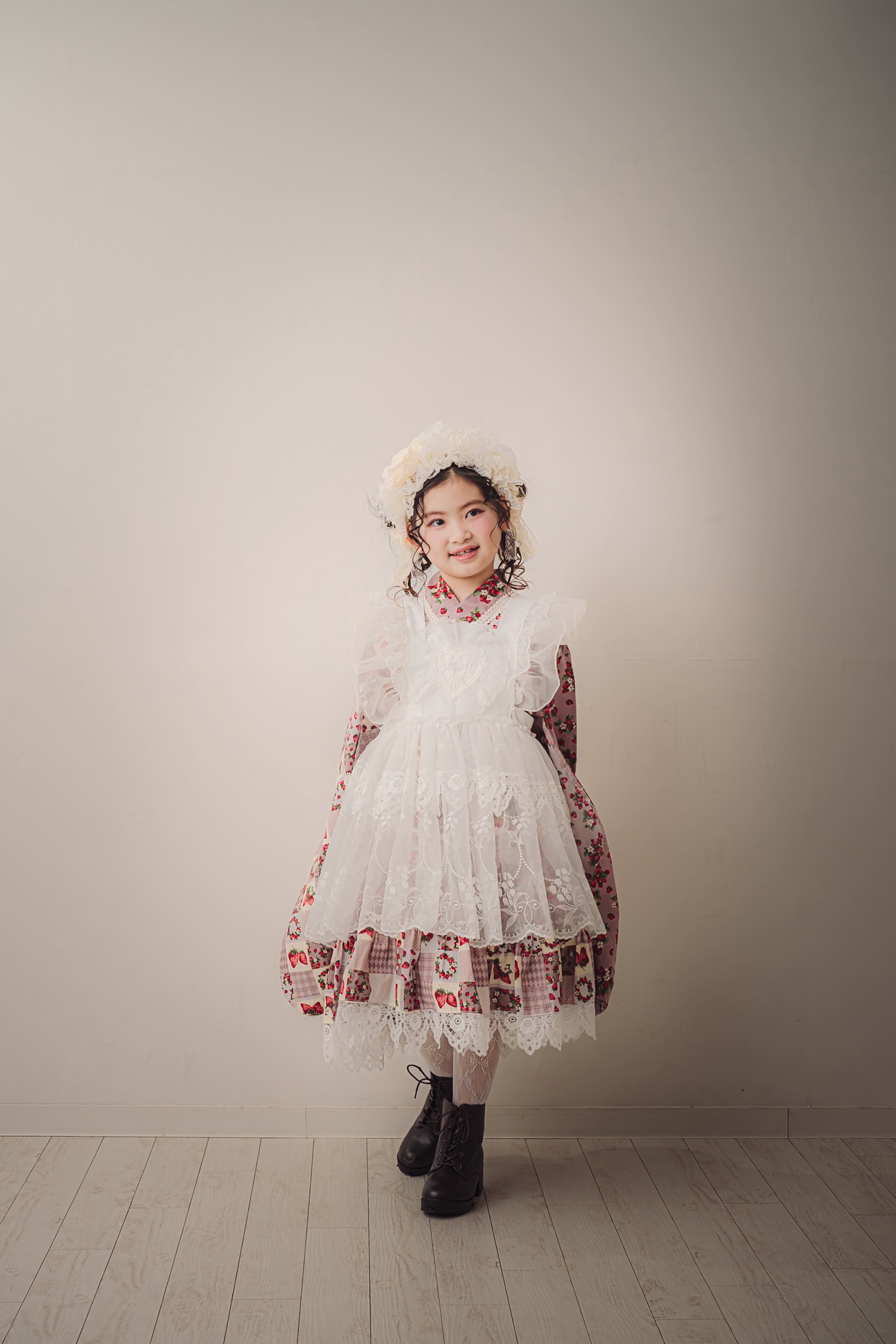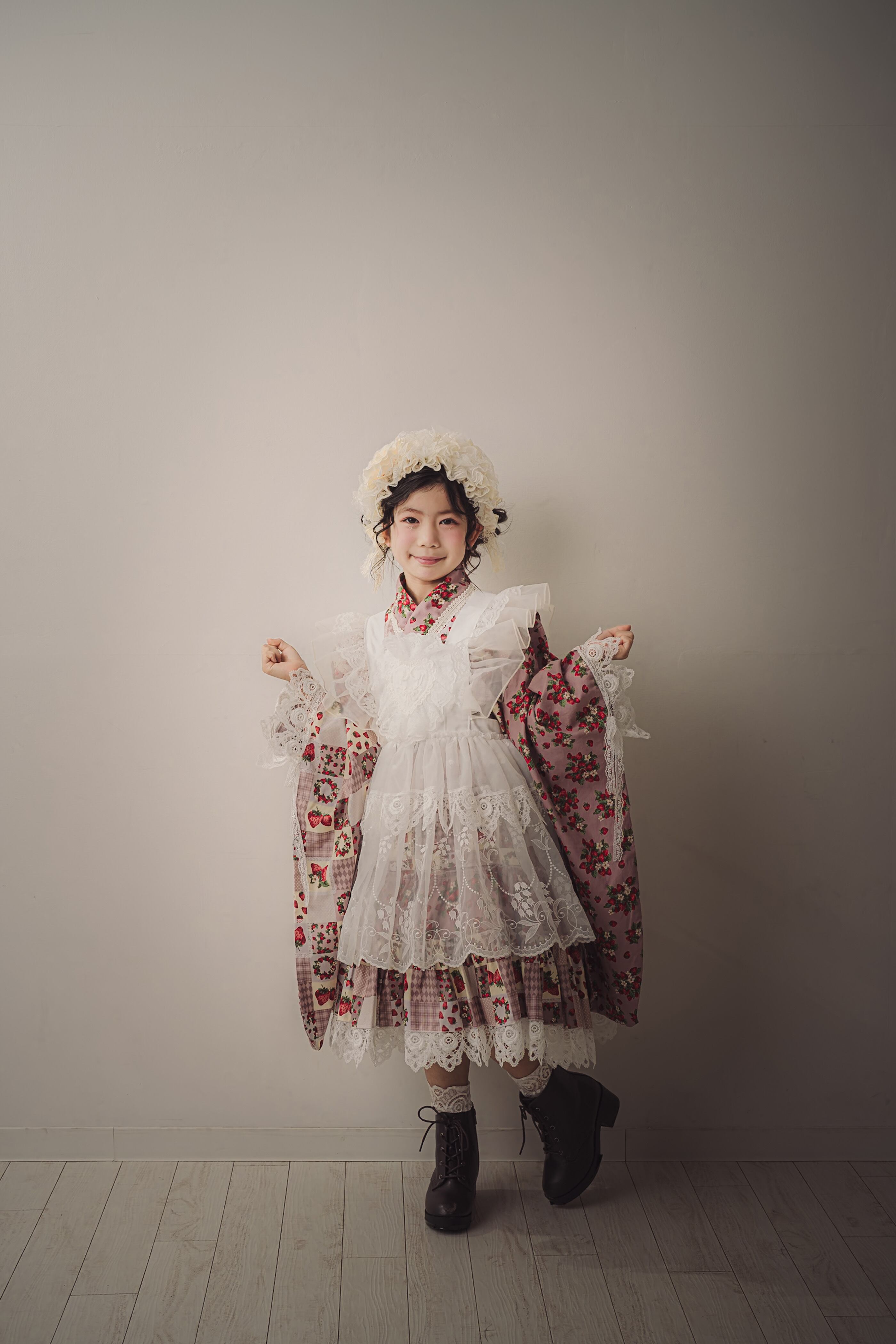 レースたっぷりのエプロンを重ねたメイドさんのようなお着物。