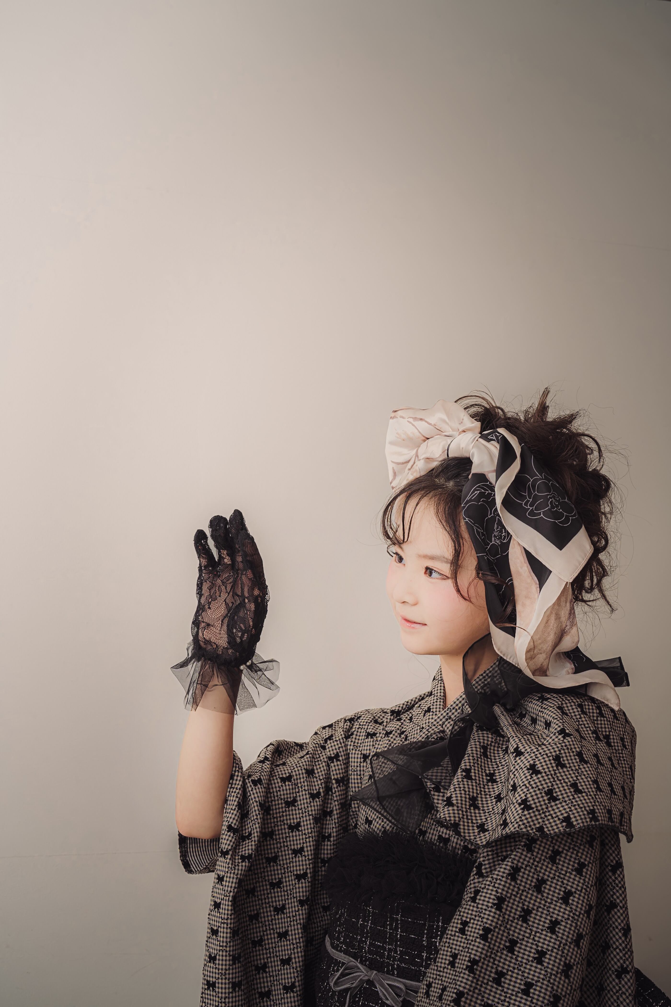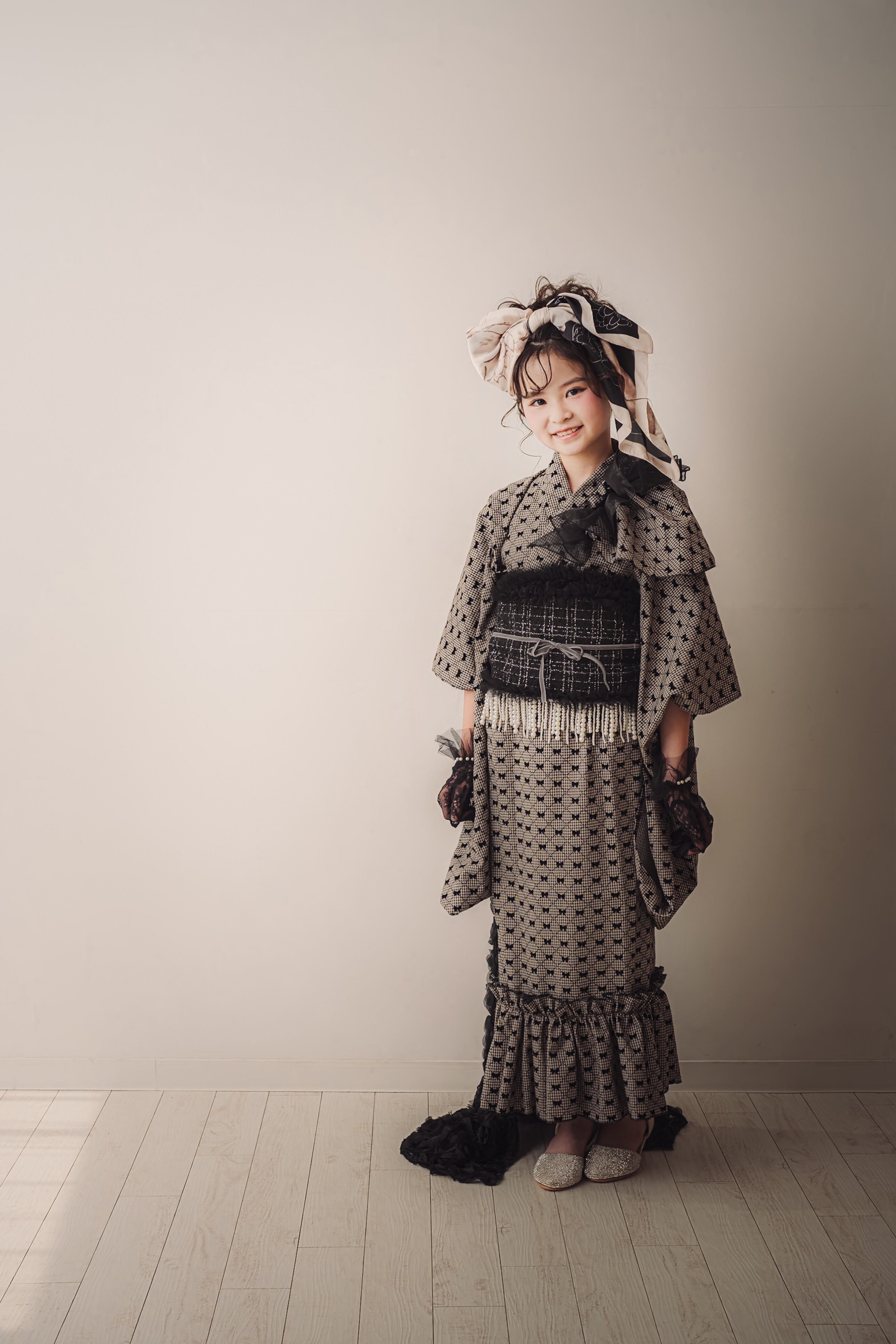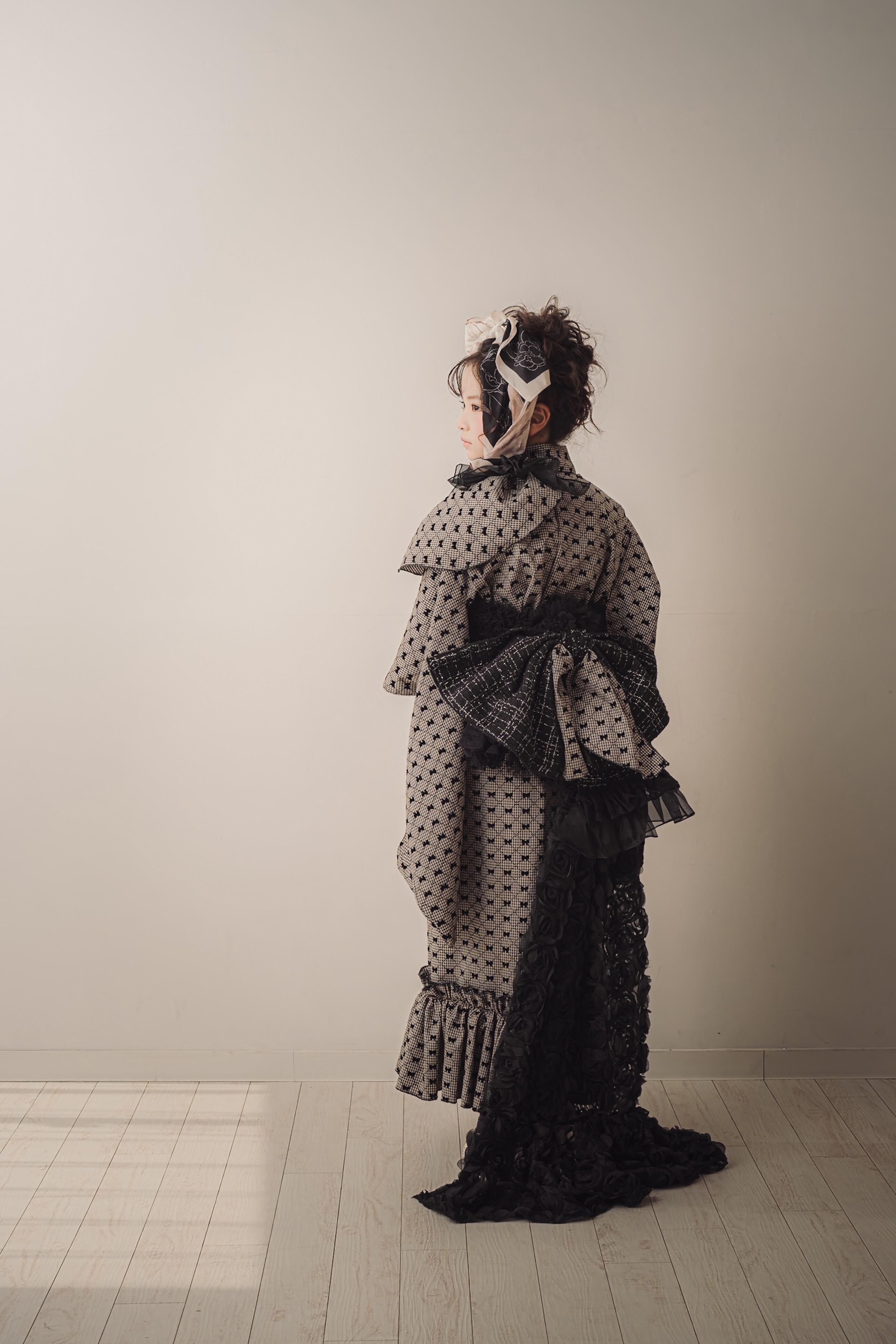 帯はツイードの黒でまとめ、華やかでクラシカルな印象に。