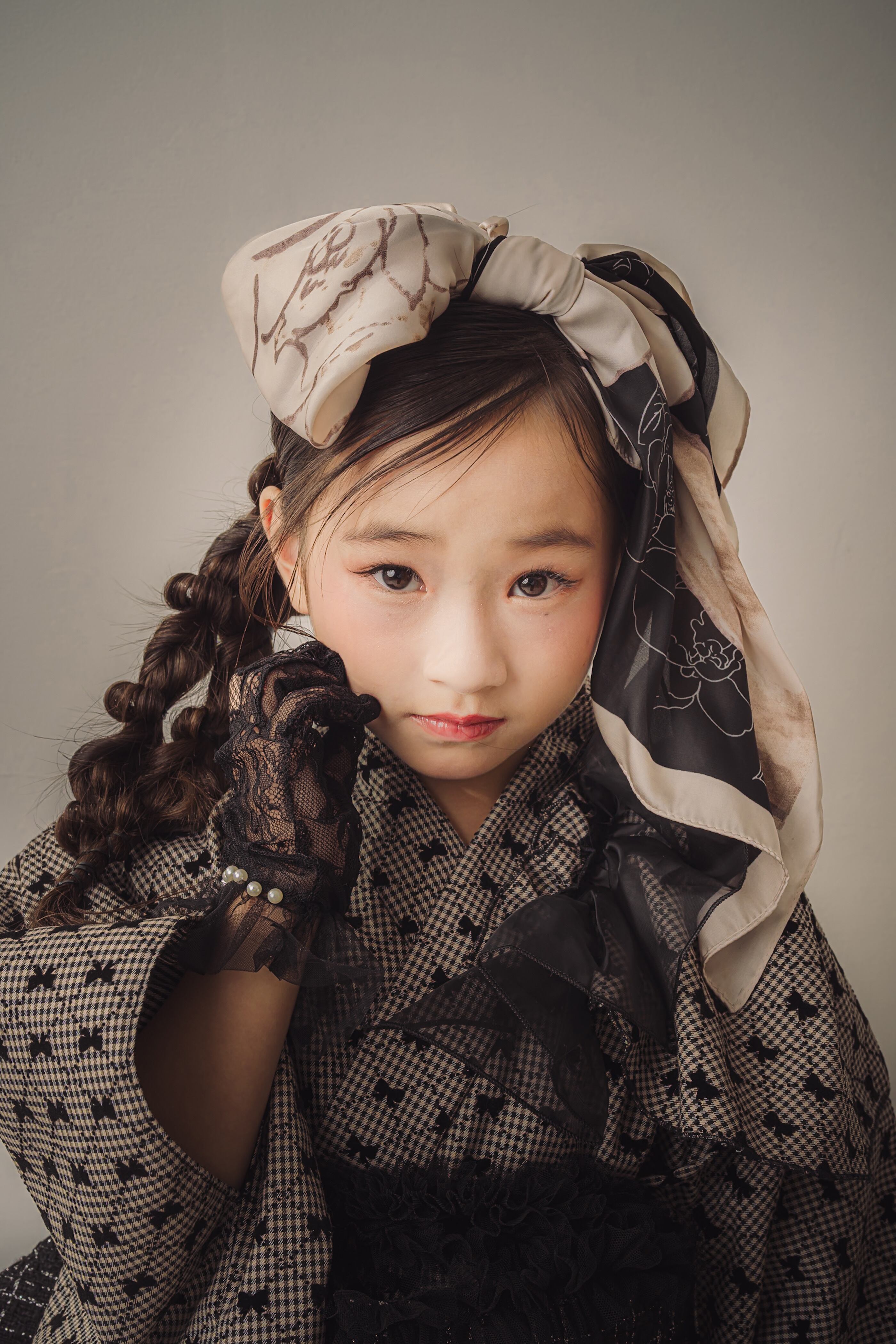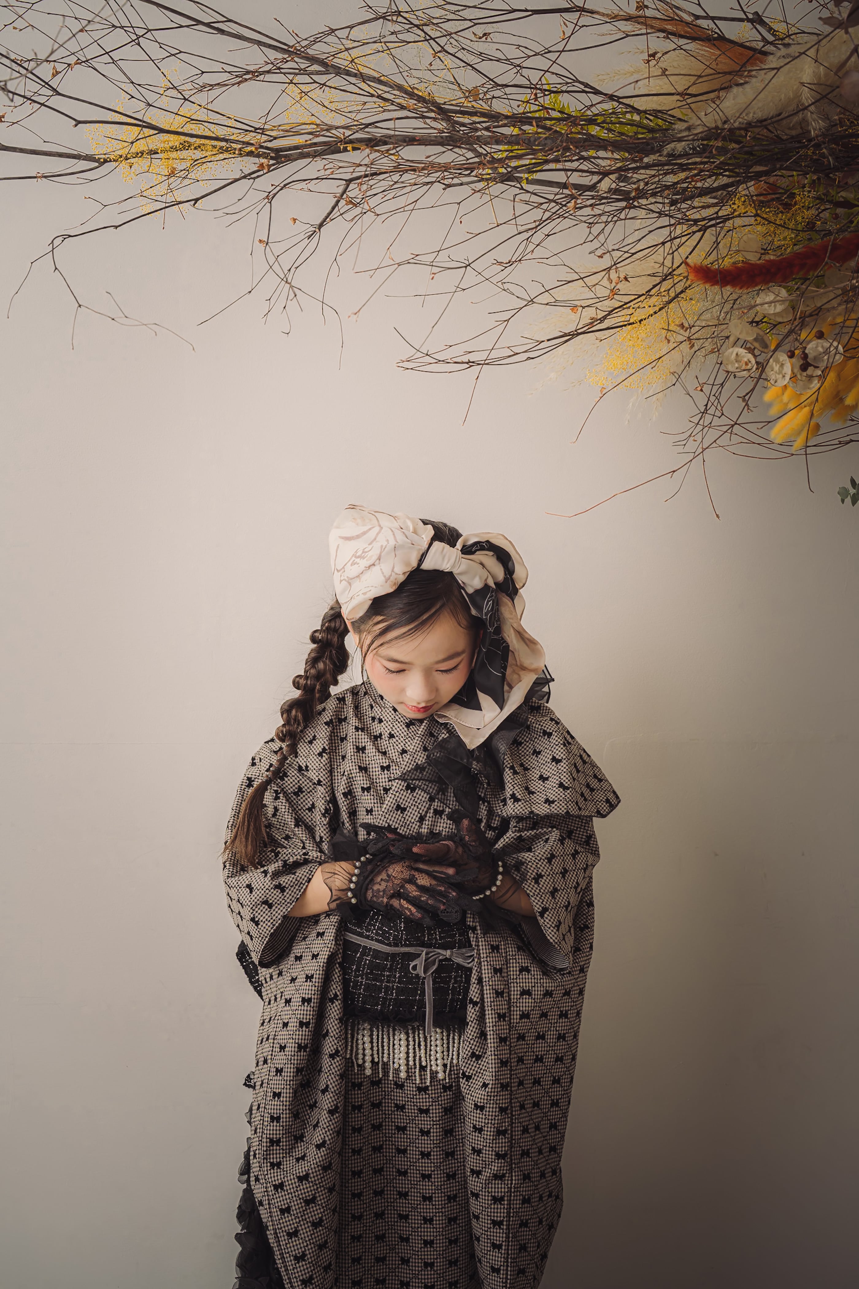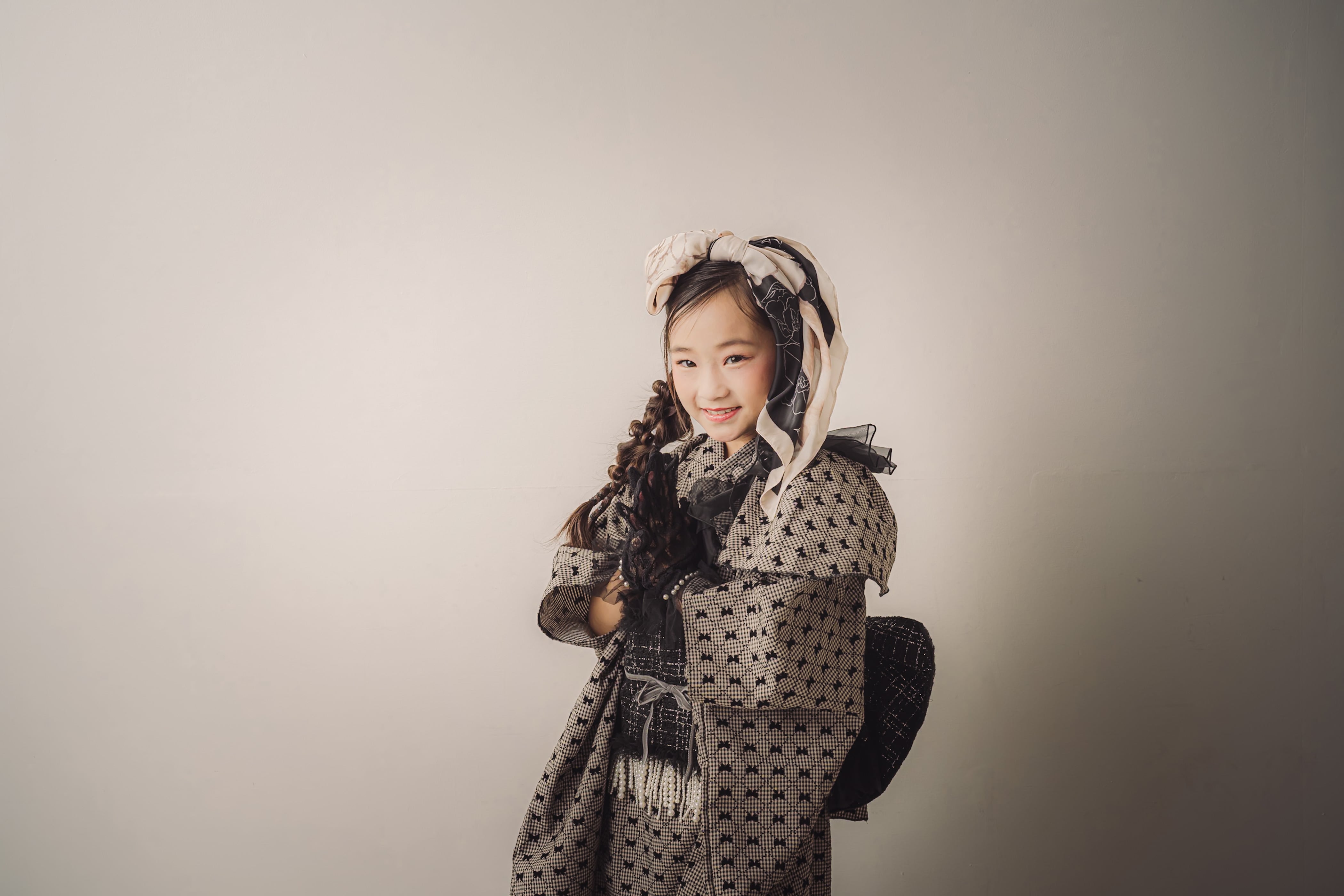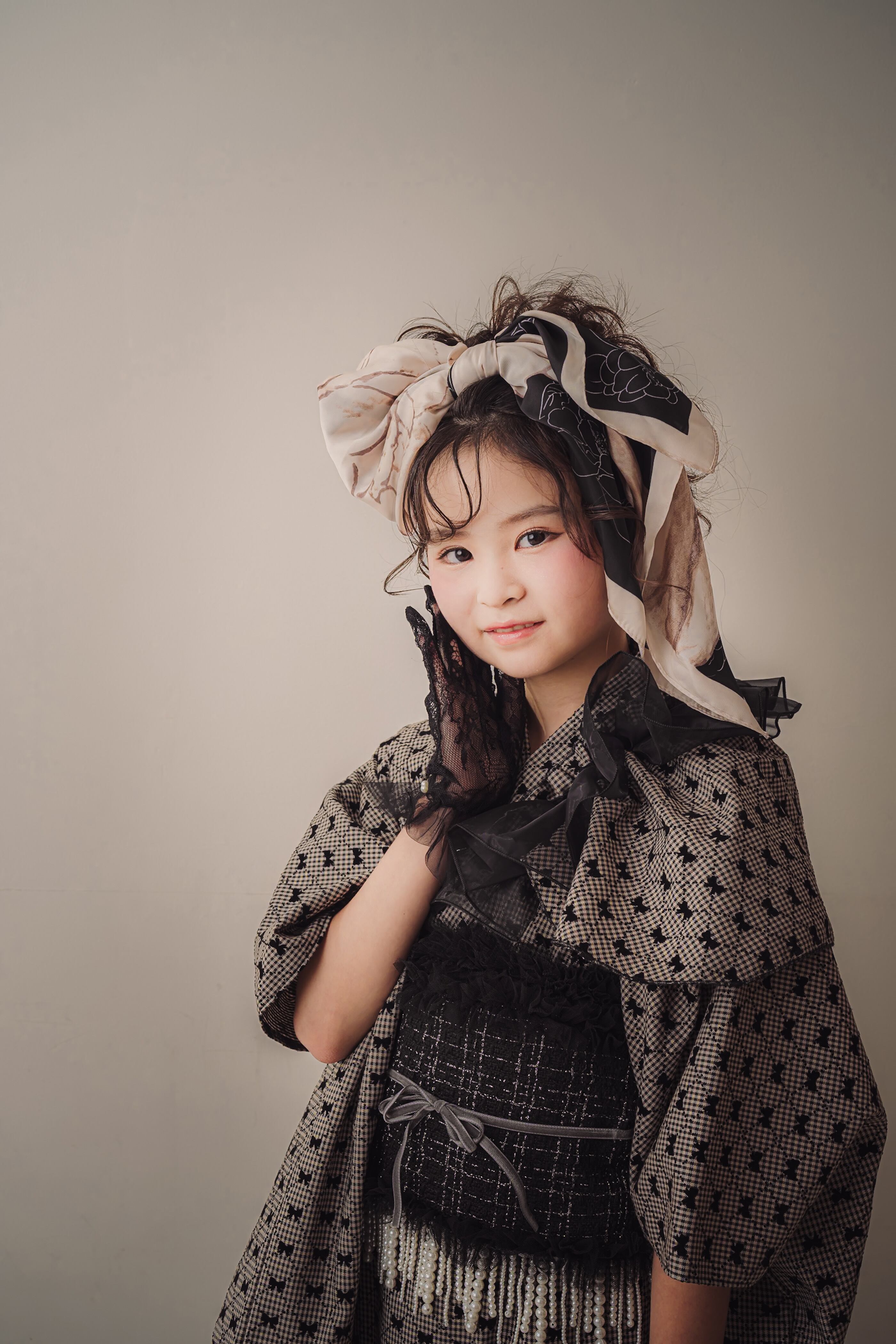 帯はツイードの黒でまとめ、華やかでクラシカルな印象に。