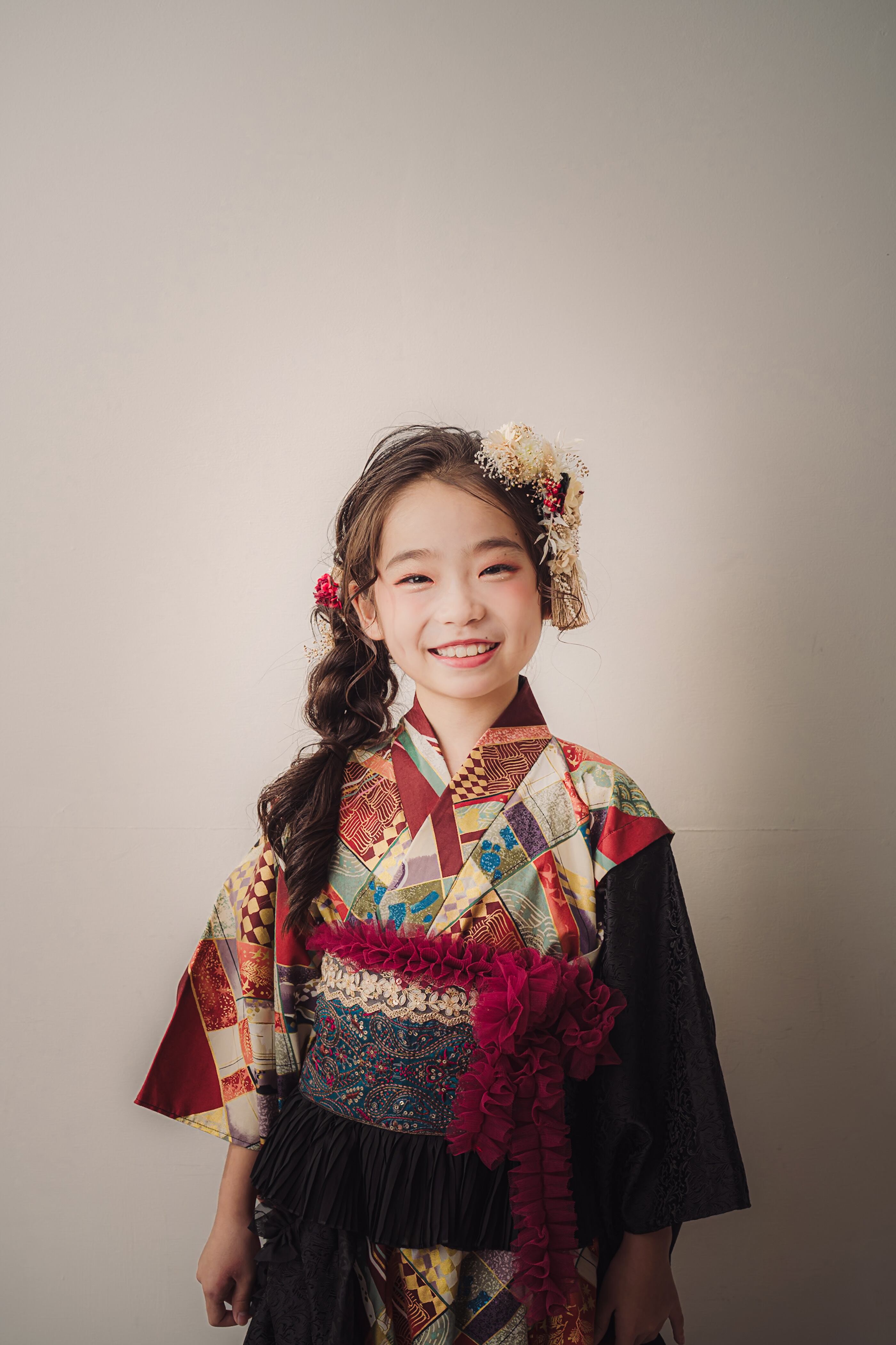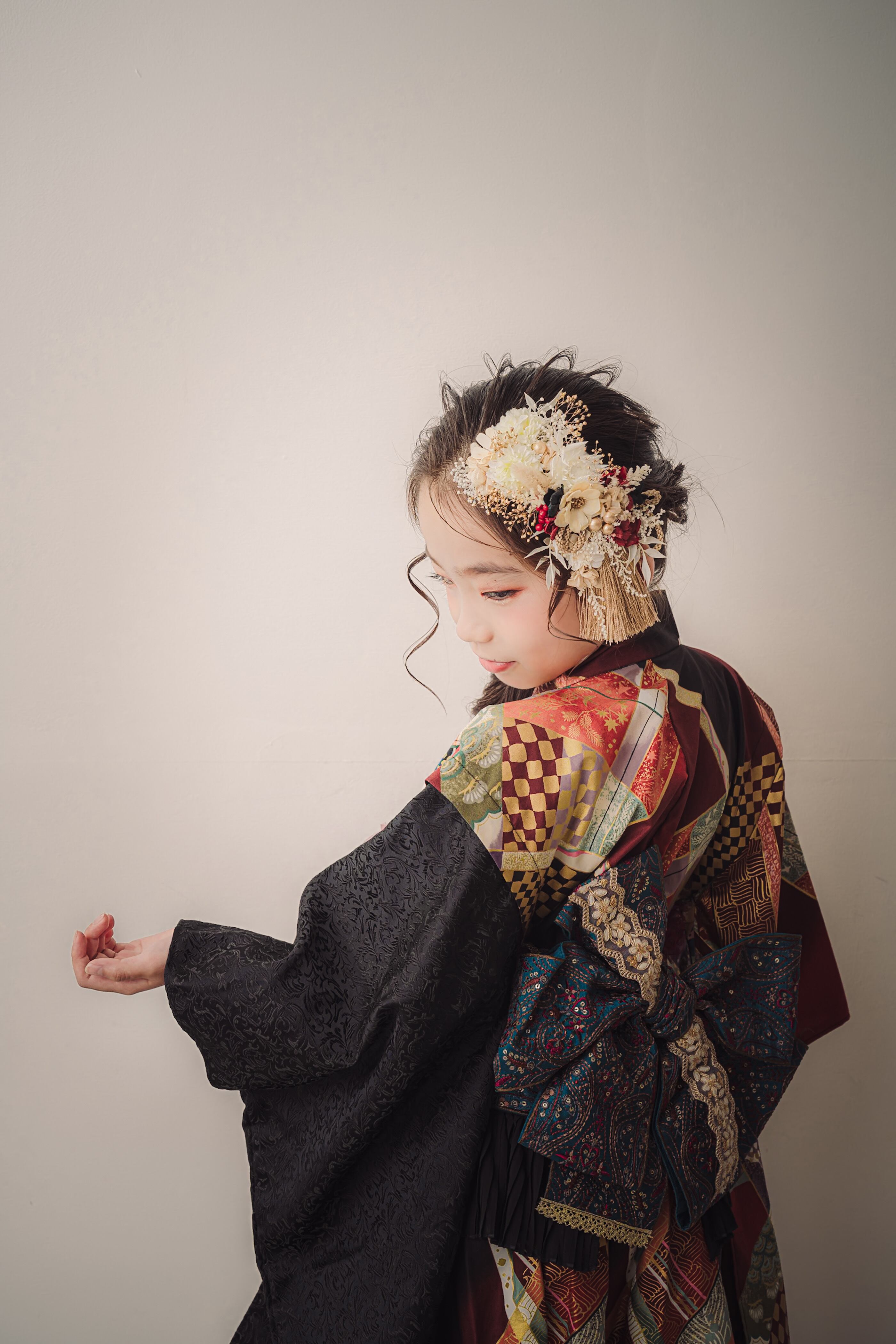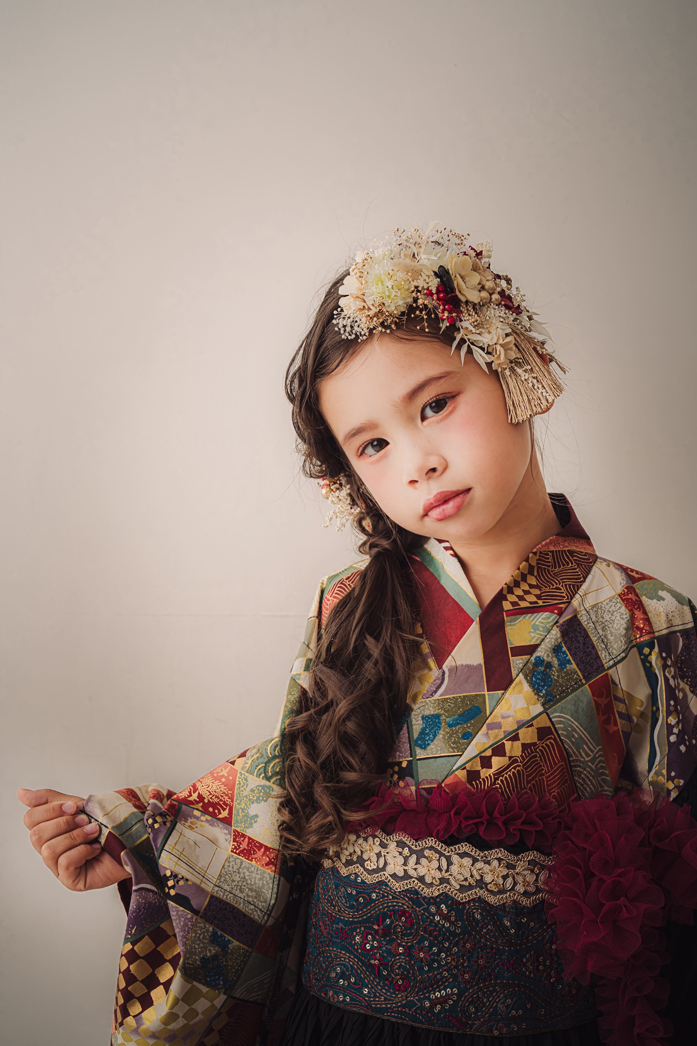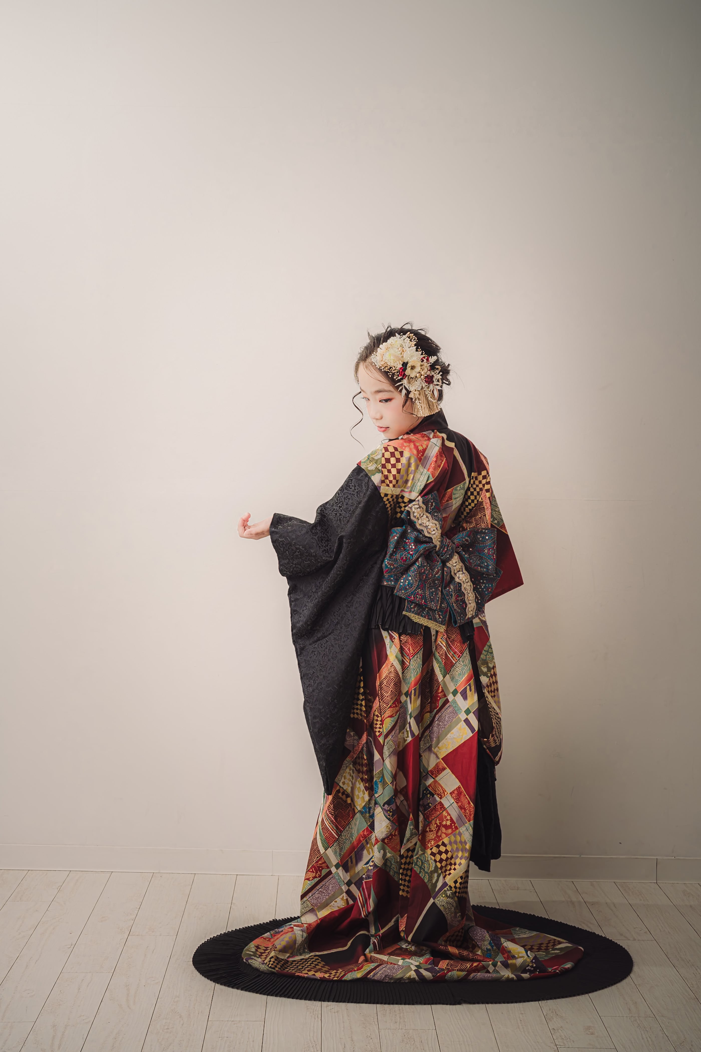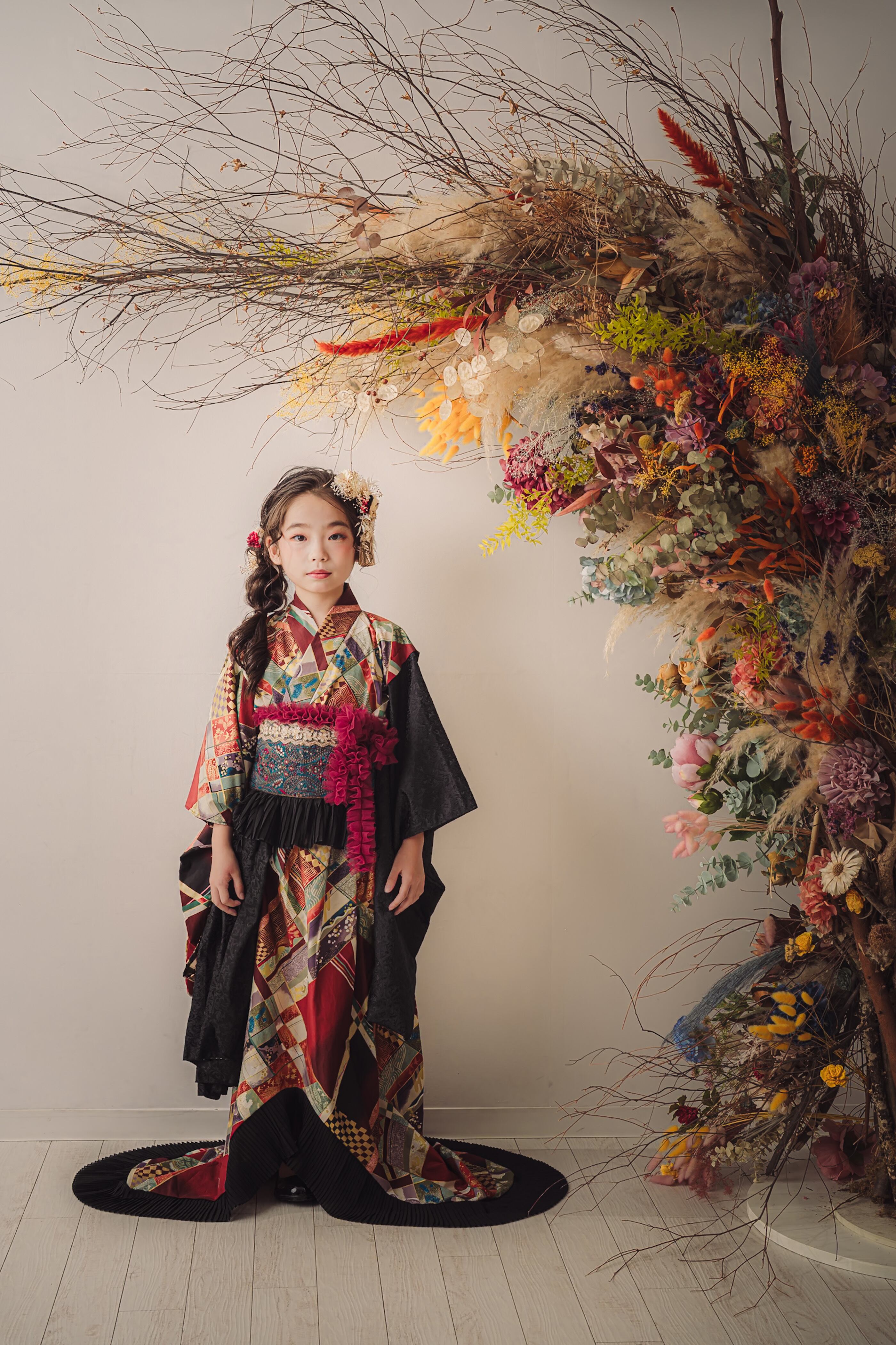 赤、ゴールド、ホワイトなど、きものに入ったお花を散りばめ、