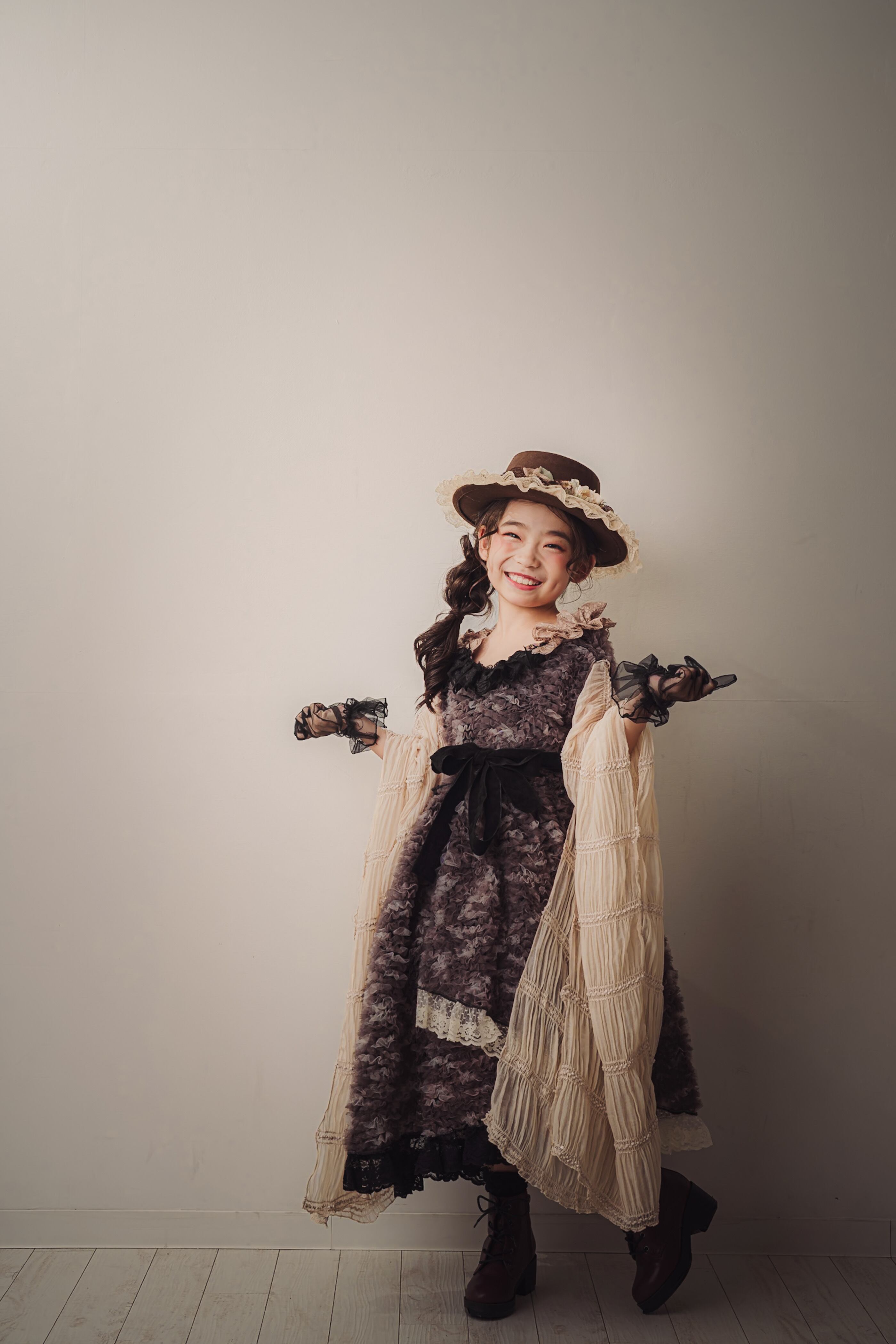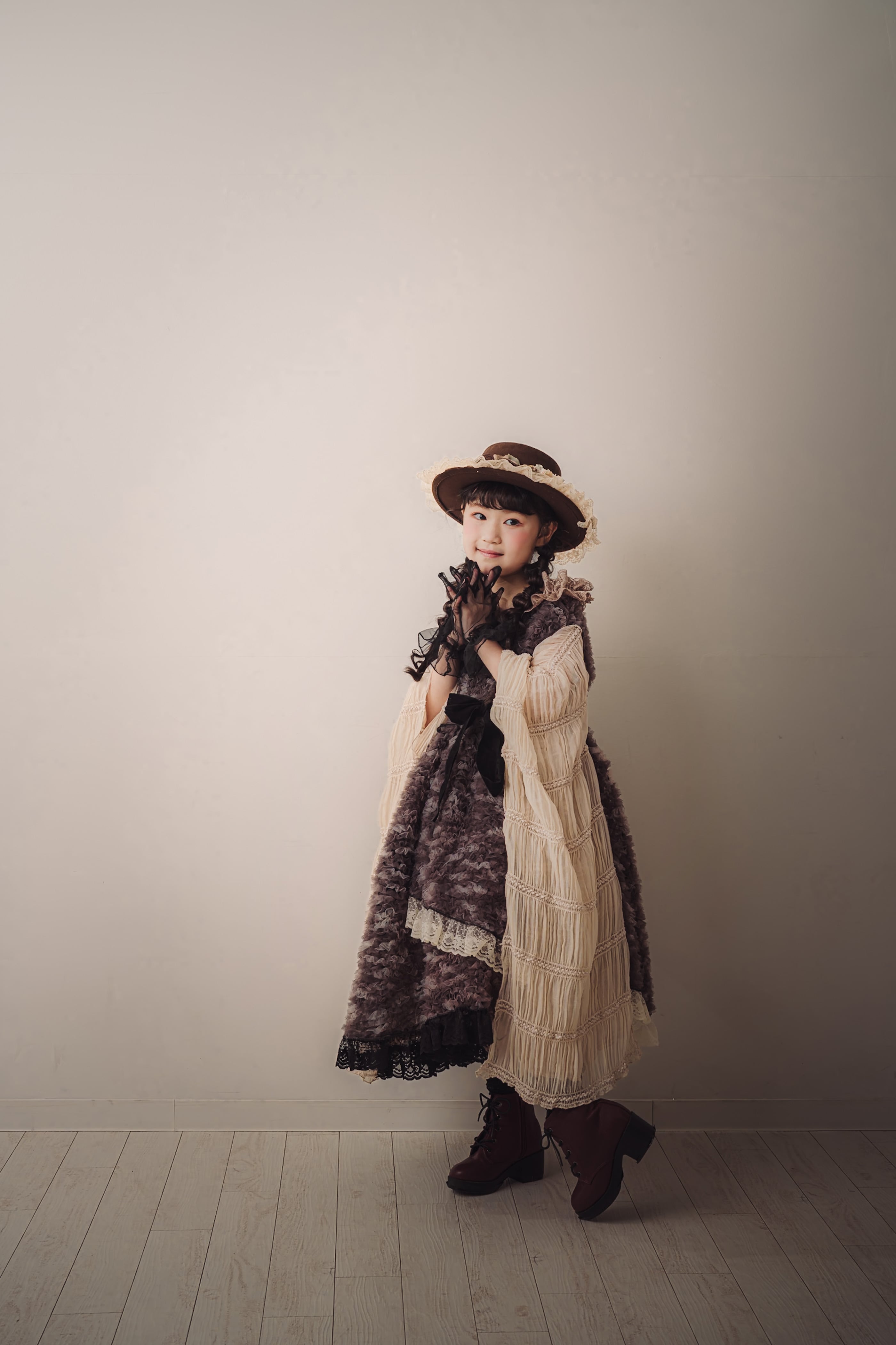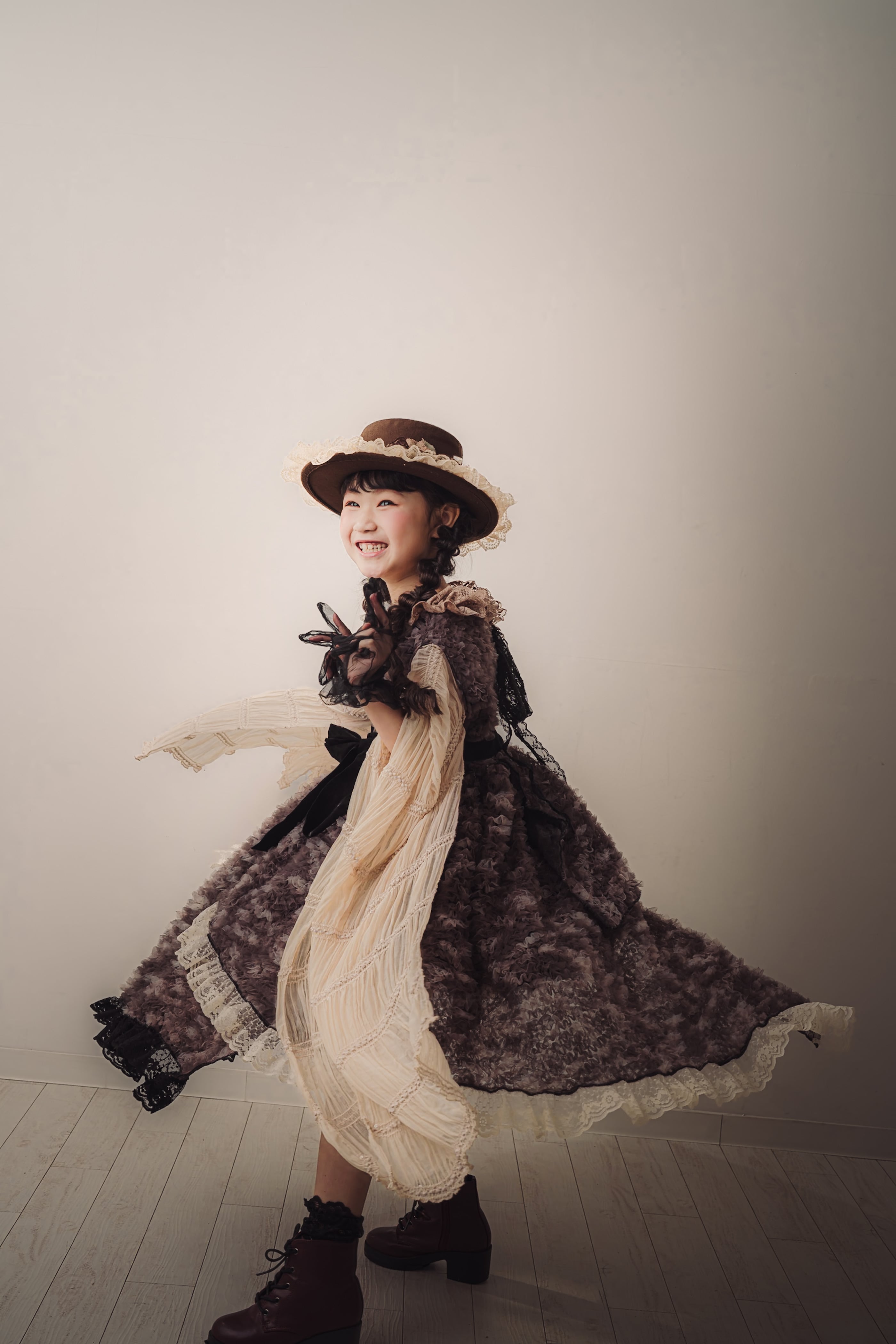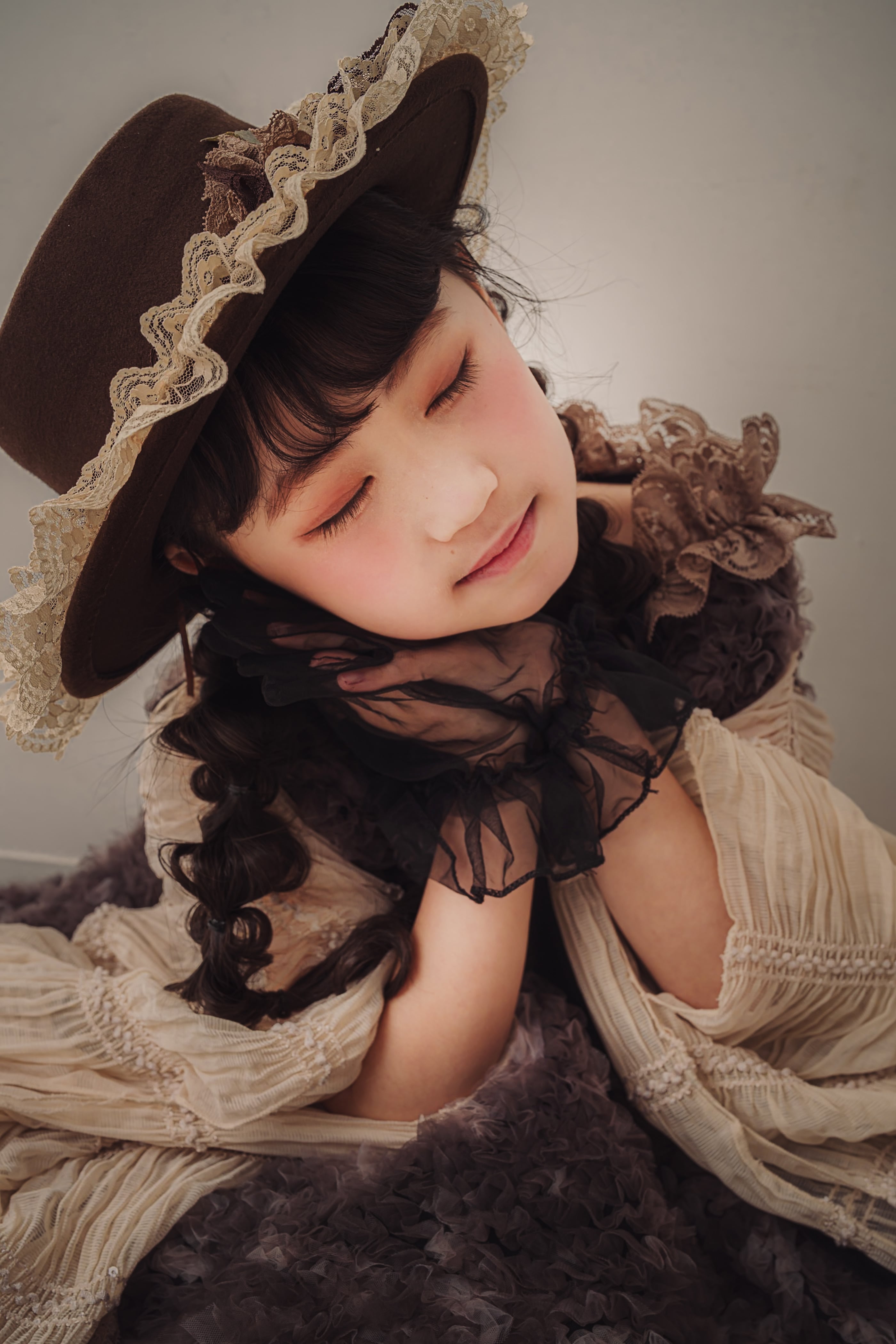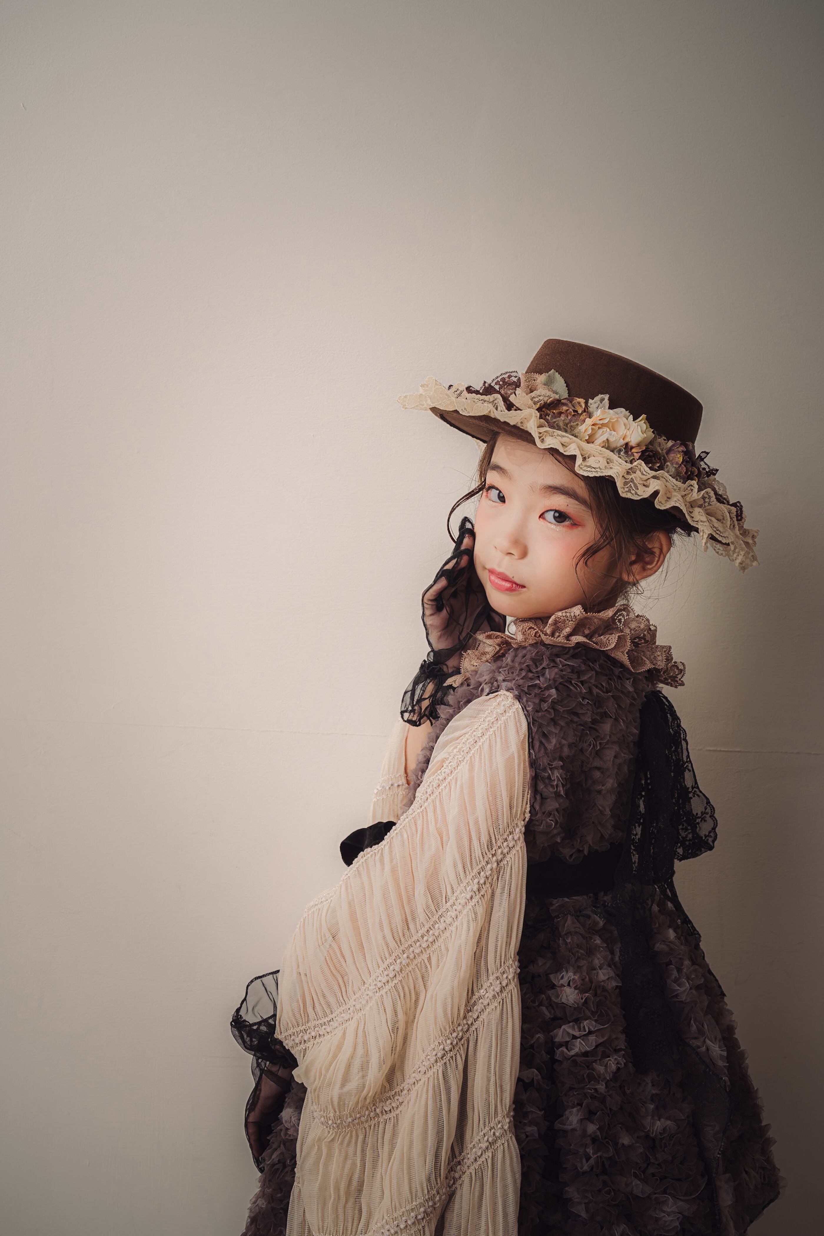 ブラウンのアンティーク調のお花やレースをあしらい、