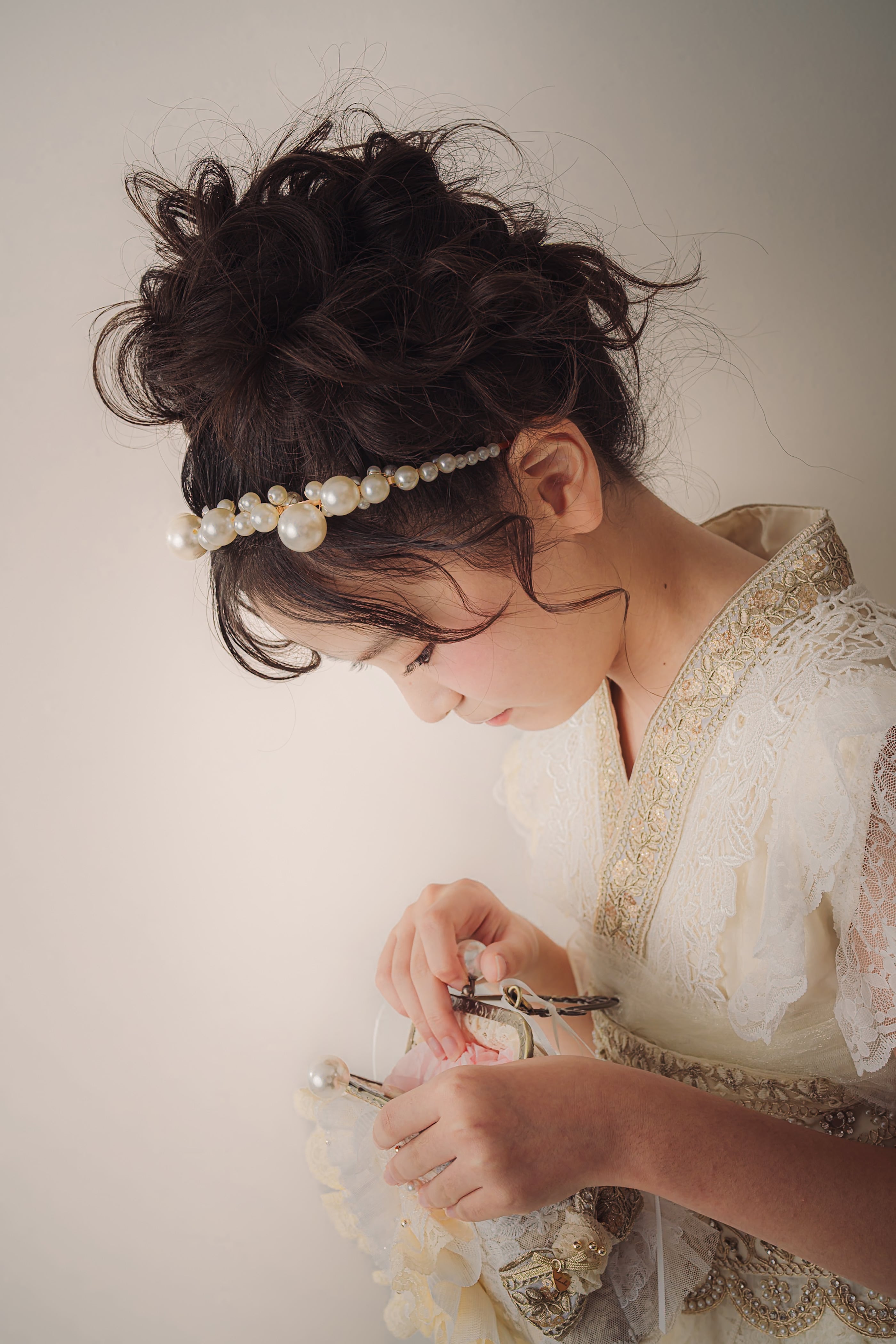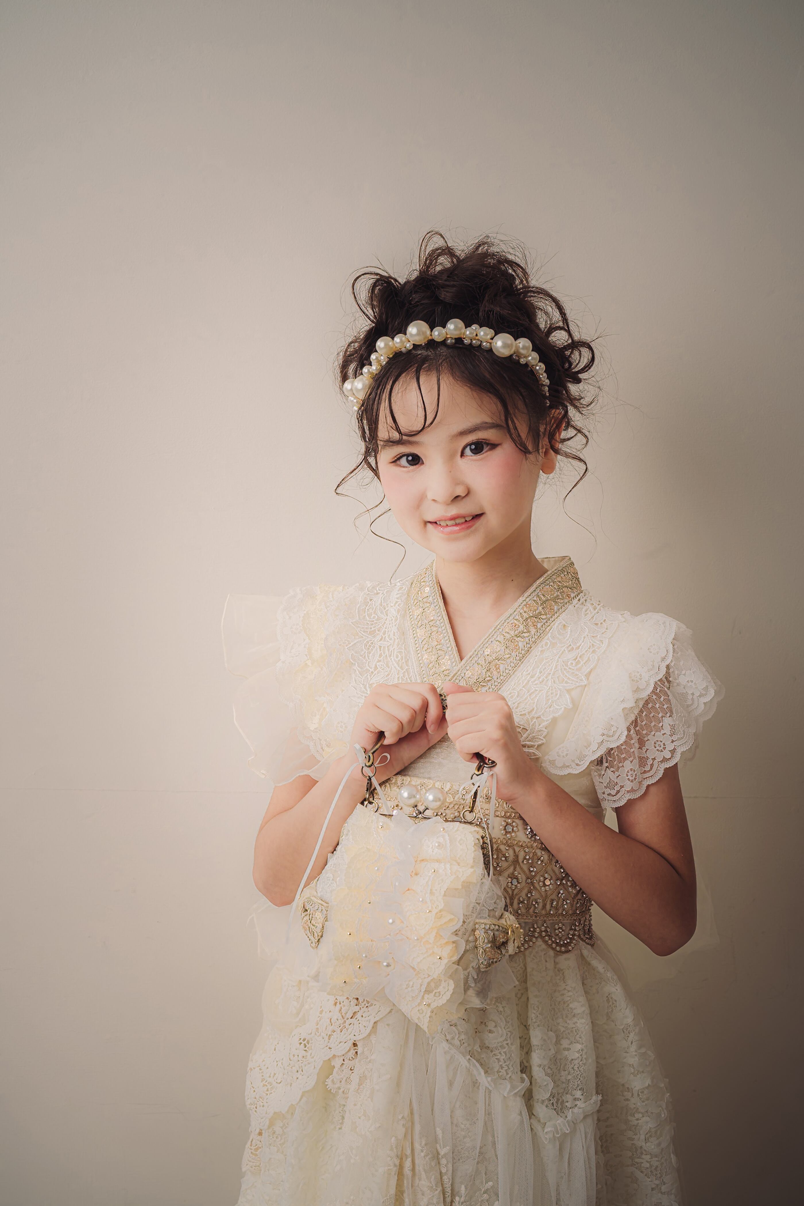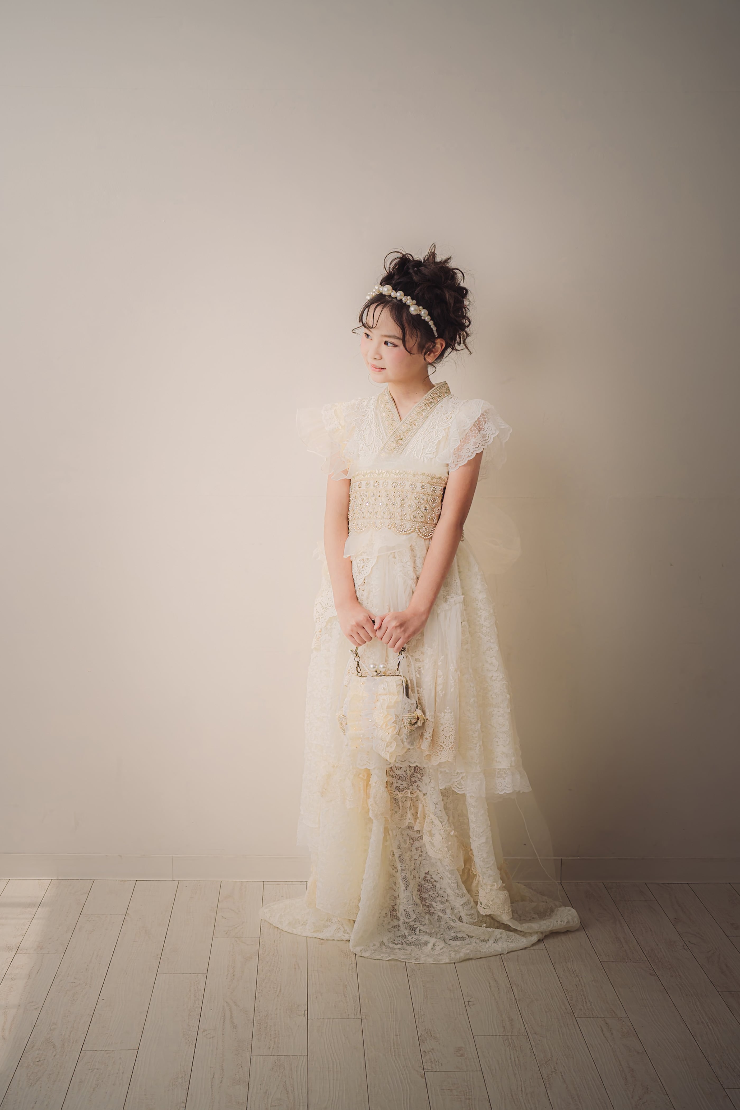 ウエストにはきらめく帯を合わせ、豪華で上品な印象に仕上げました。