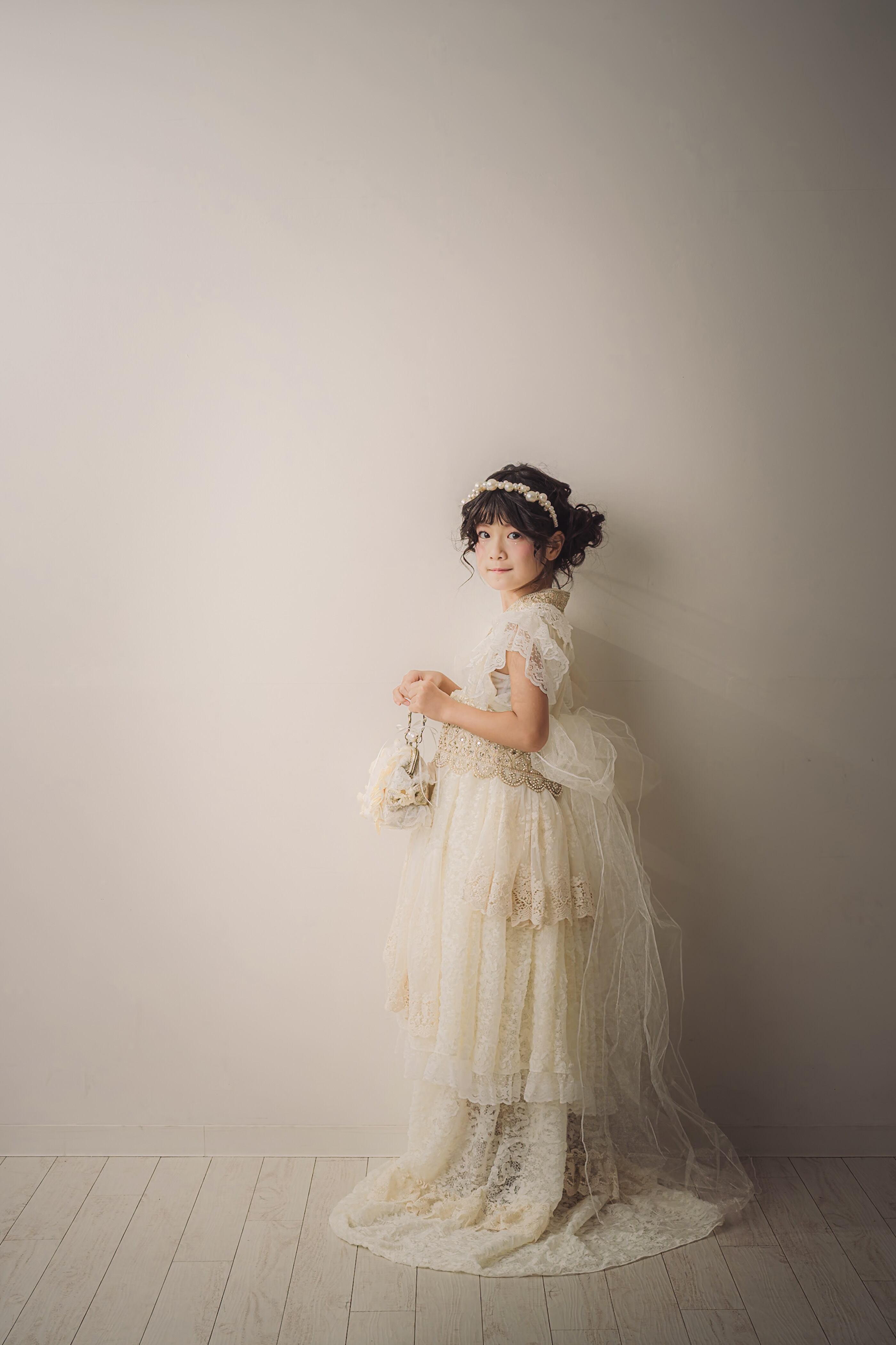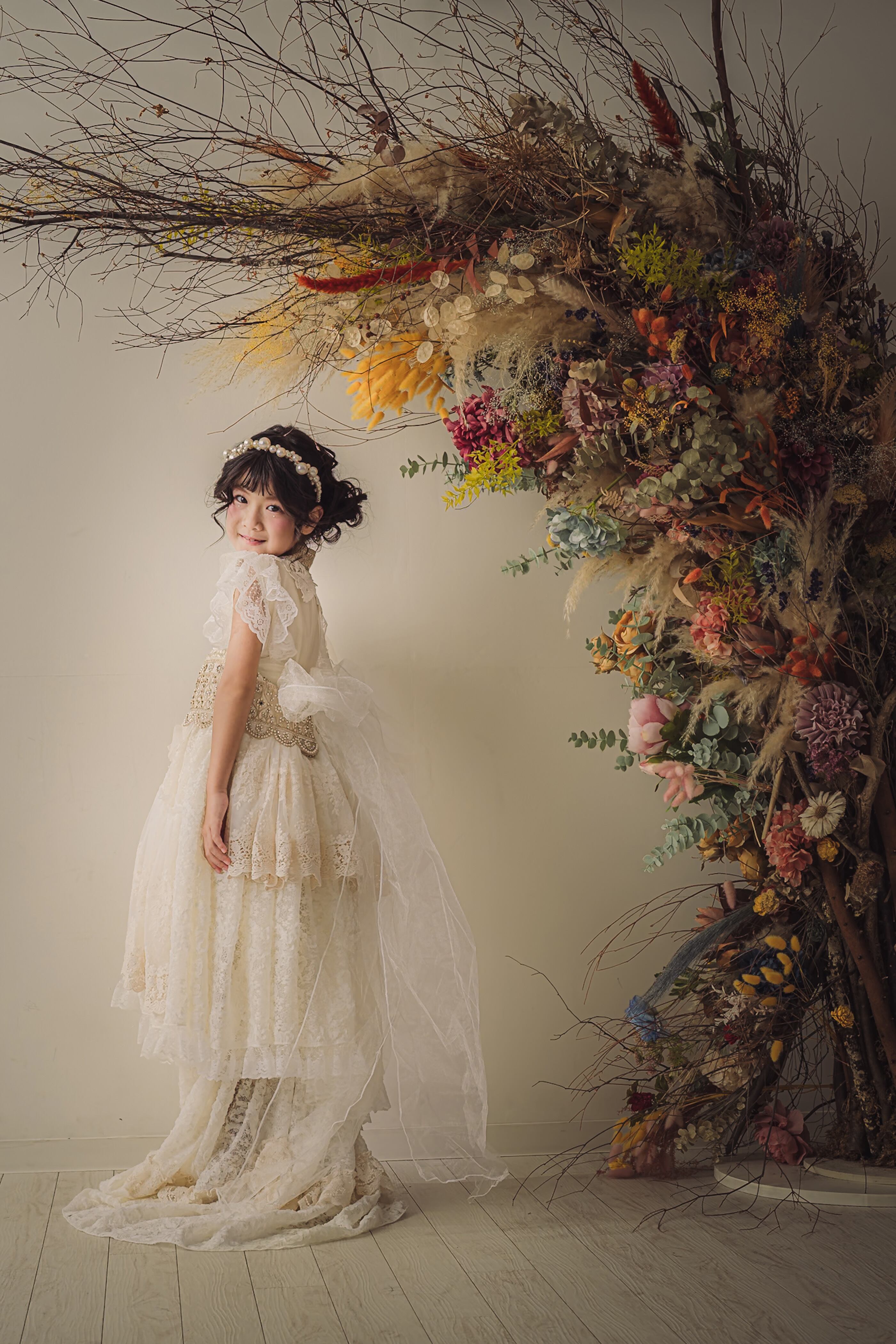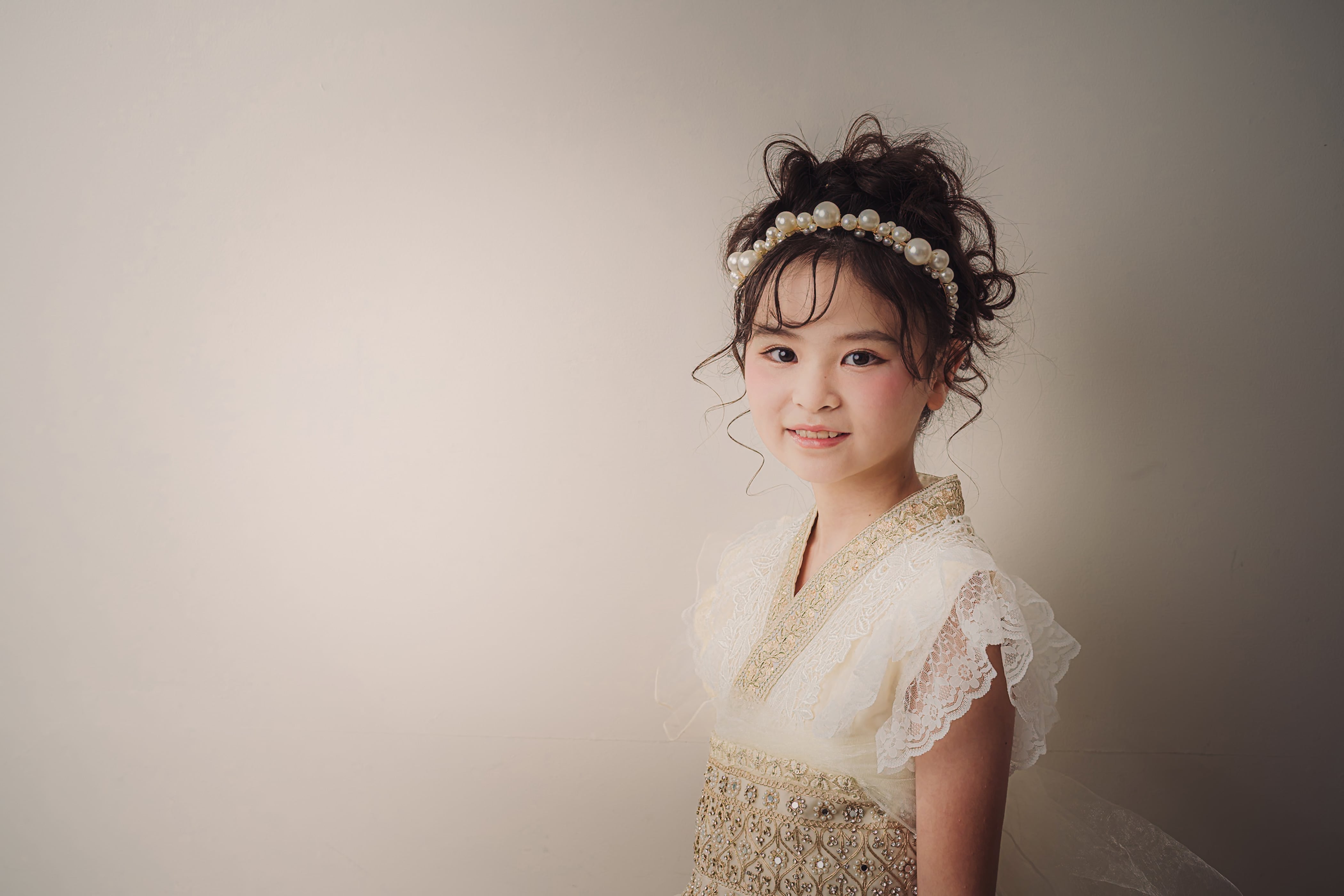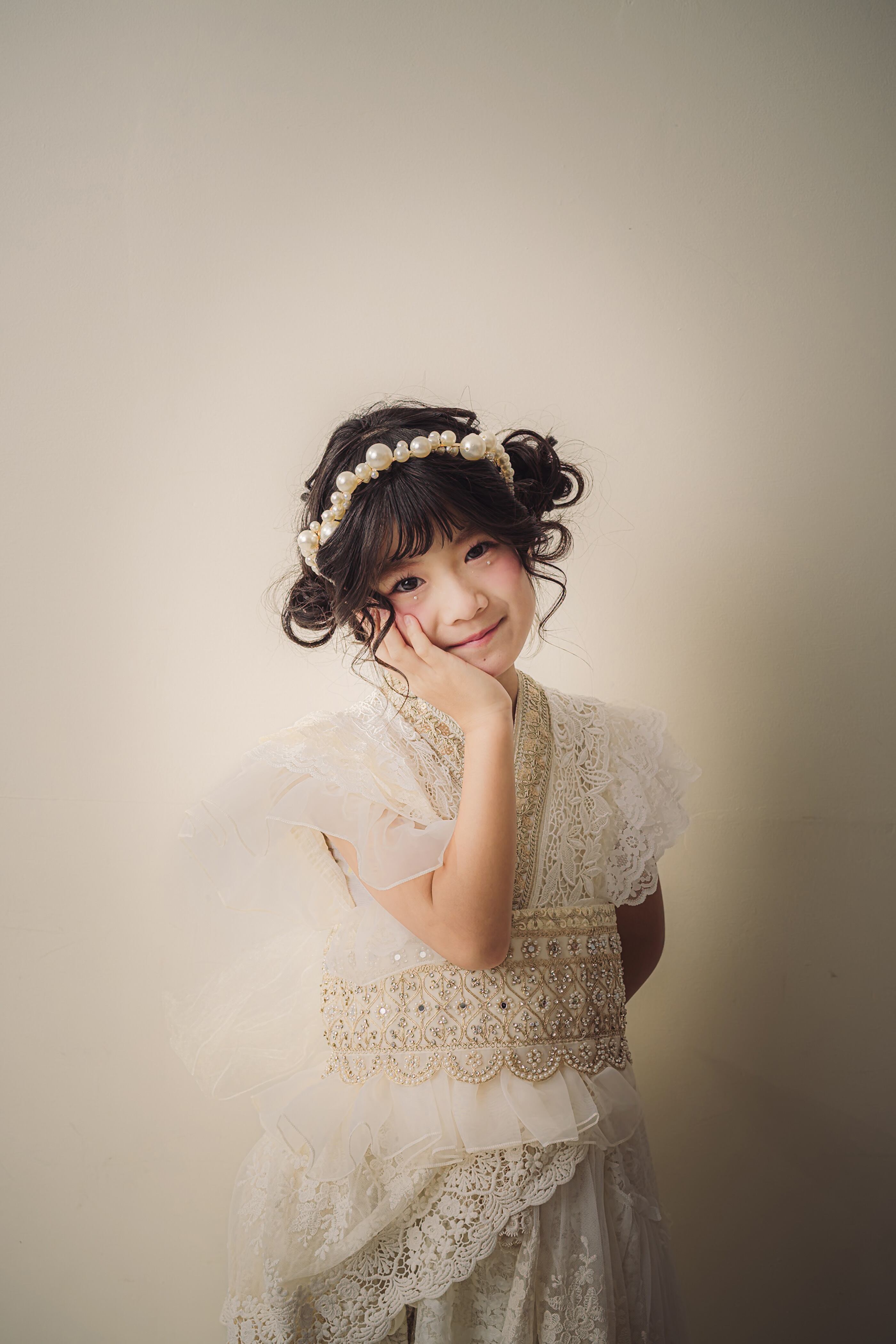 ウエストにはきらめく帯を合わせ、豪華で上品な印象に仕上げました。